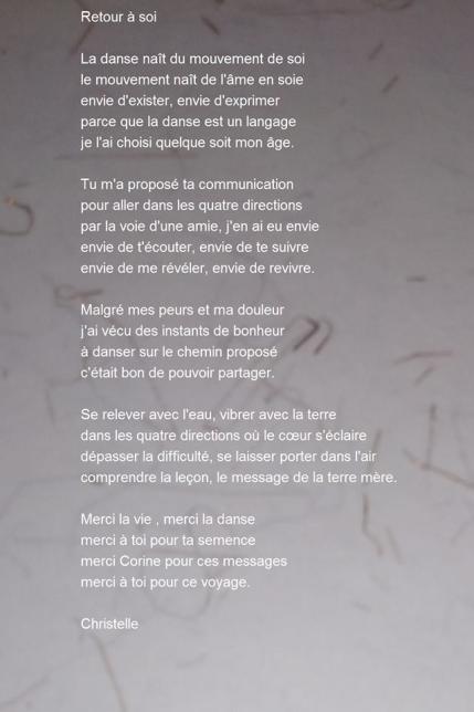 Nous avons terminé par une danse merveilleuse sur la chanson de Laurent Voulzy « Le soleil donne », puis une discussion sur nos ressentis. Je suis vraiment très, très heureuse d’avoir participé à cet atelier. Le soleil ne dansait plus seulement à l’extérieur, il dansait aussi dans mon jardin intérieur ! merci Corine !