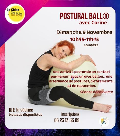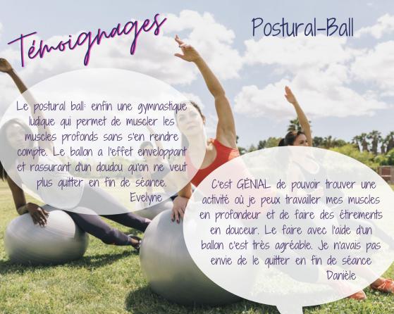 Le Postural Ball® se pratique en chorégraphie, avec fluidité, sur de la musique douce et en contact permanent avec un gros ballon. Il est fondé sur l’alternance de postures statiques - d’étirements passifs et de relaxation sans contraction musculaire volontaire, avec des transitions précises et 3 principes d’actions spécifiques à la méthode. Il permet à la fois de renforcer tous les muscles profonds et de relaxer le corps et le mental. Il est préventif. Son objectif est de ramener le corps dans un alignement idéal, créant ainsi une forte stabilité, limitant de ce fait douleurs et blessures permanentes.